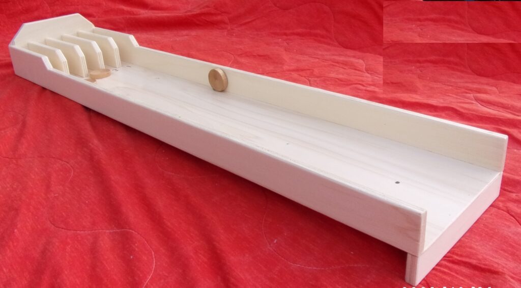 Zet een sjoelschijf op zijn kant op de stip en laat deze naar beneden rollen.